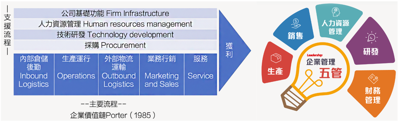 管理大師麥可波特(Miehael Porter)提出的「價值鏈分析」(如下圖),將企業內外 Add-value(價值增加)的活動分為主要流程和支援流程,組織的主要流程及支援流程等各項相互關聯的經營活動,構成一個創造價值的動態過程,即價值鏈。領導力企管遵循 Porter 價值鏈的核心精神,就價值鏈再簡化為「產銷人發財」企業管理的五大核心領域。
