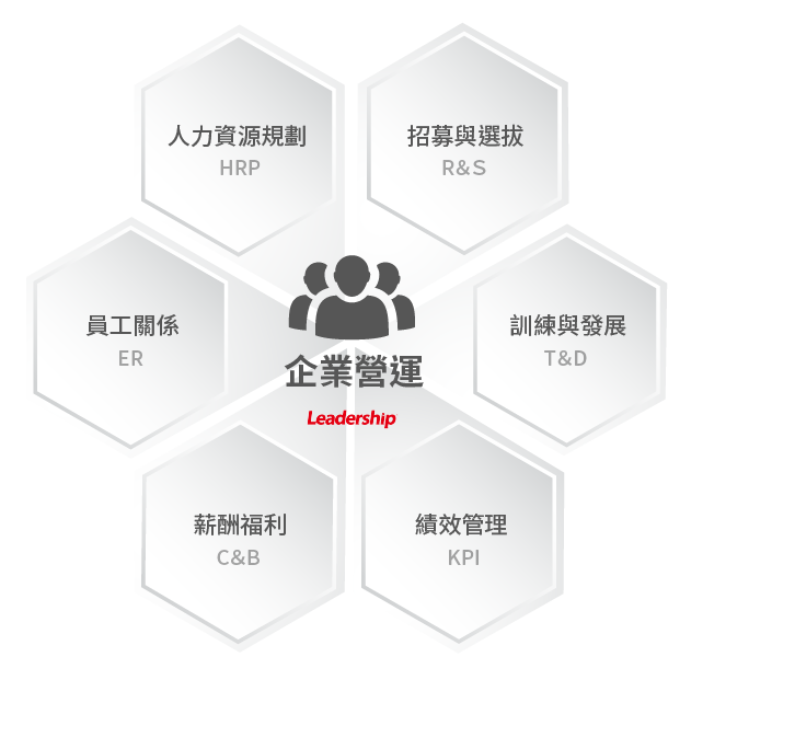 人力資源管理以企業營運政策與方向為基礎,依功能及範疇分為以下6大模塊:
