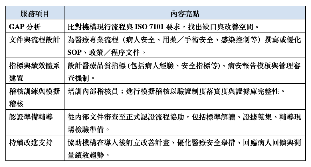 為協助醫療機構成功導入 ISO 7101:2023,我们提供一站式專業服務:
