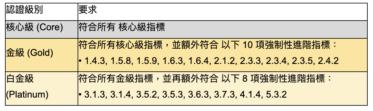 資料來源:AWS Guidance Note: Changes to AWS Advanced Indicators for Gold & Platinum Certification Levels