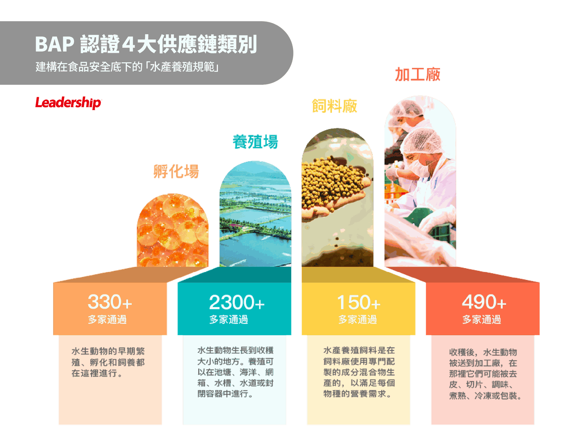 ★ 4星認證:水產加工廠、養殖場、孵化場、飼料廠皆通過了 BAP 審核認證。