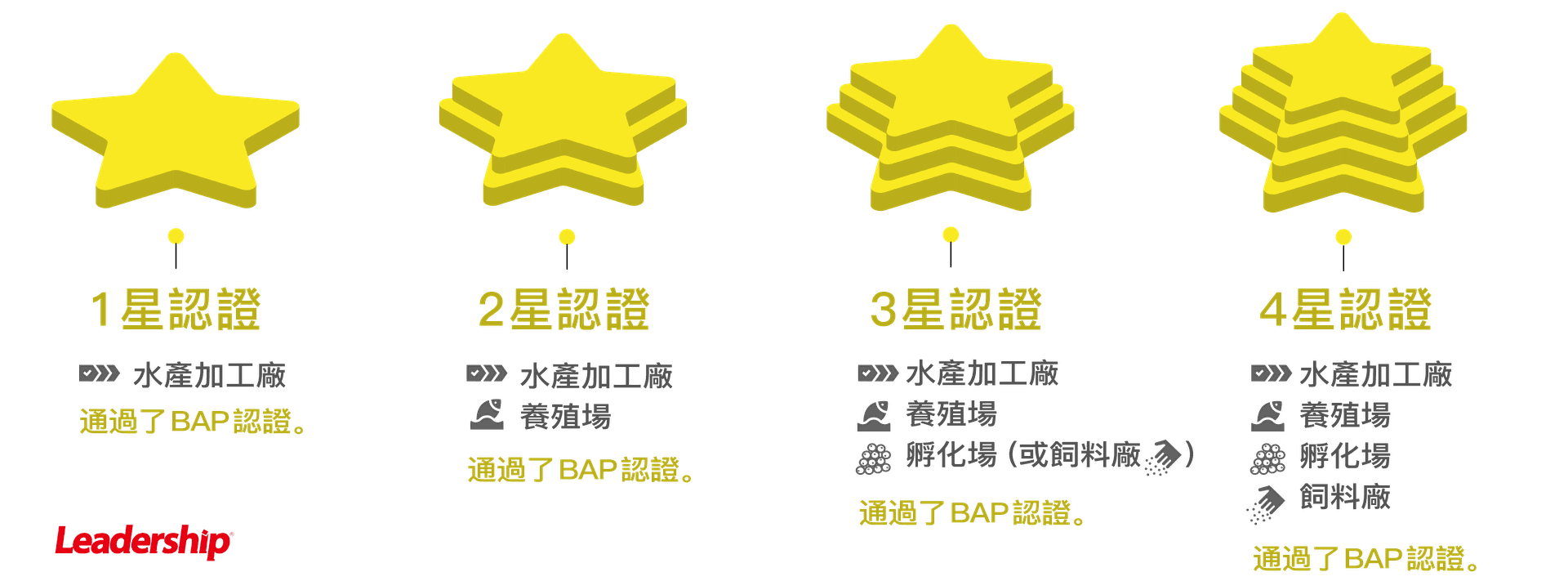 BAP 認證採用了 ★ 星級制度來區分獲證的組織在水產養殖生產鏈的等級: