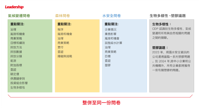 從以往問卷內容來看,有一些問題會重複出現在三份不同問卷中,因此 CDP 將這些問題整合起來,為企業增加填答體驗並鼓勵企業全面思考環境管理。