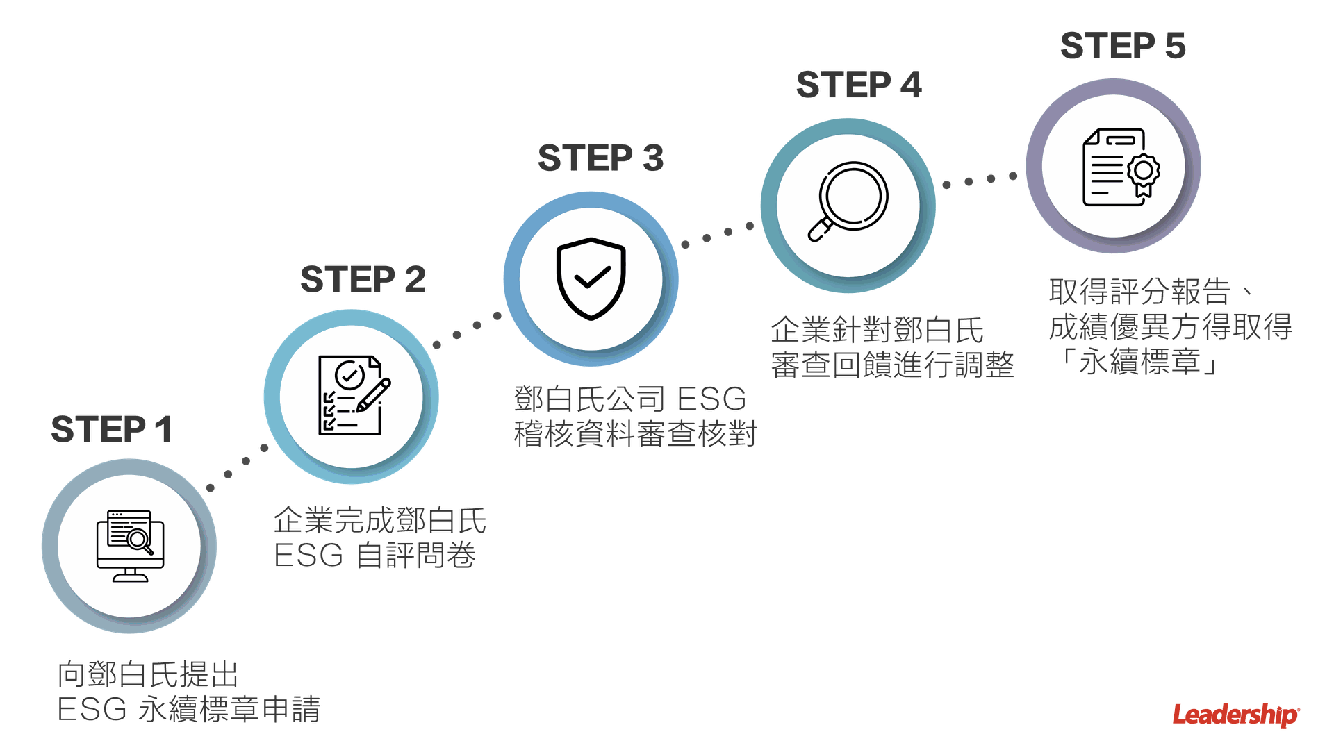 領導力企管不僅輔導 ESG,也實踐 ESG;於鄧白氏永續評鑑:環境保護、社會責任及公司治理的 ESG 三面向亦取得優於同業水準的佳績,對於剛接觸或正要踏入國際市場的公司企業,或許會被滿山滿谷的問卷題項搞得迷失方向。一般要獲得任何 ESG 評鑑高分的企業,企業若想取得永續認證的建議步驟有以下: