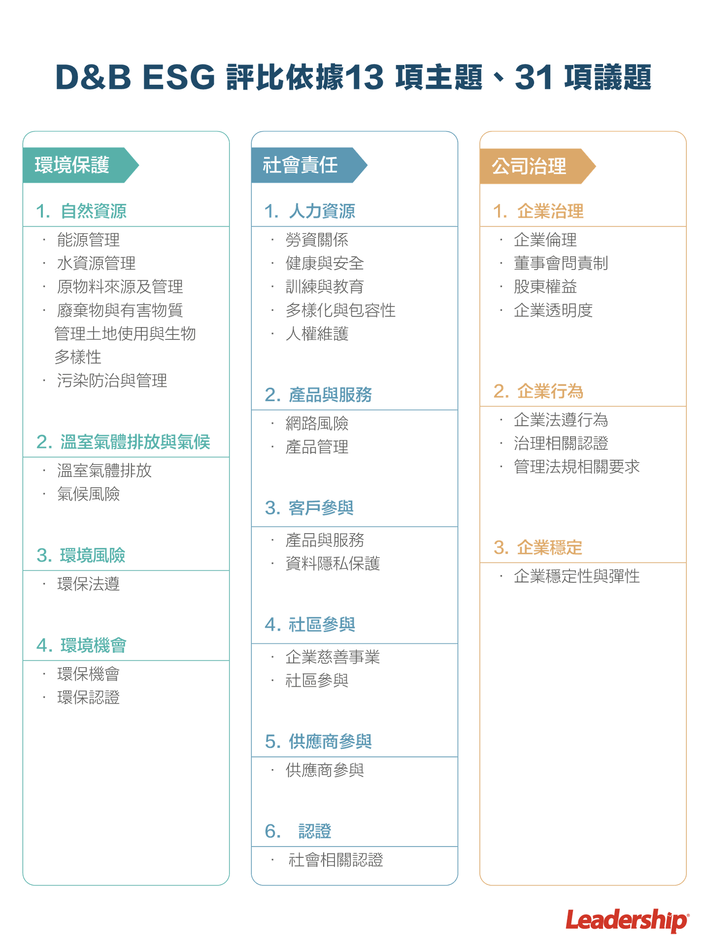企業必須完成 ESG 自評項目,由鄧白氏公司和各種主題專家所設計的 ESG 評估問卷,其主題符合國際六大永續準則架構(SASB、GRI、TCFD、UN SDGs、UN PRI、CDP),依據 13 項主題,31 項議題在環境保護 (E)、社會責任 (S)、公司治理 (G),綜合計算而成,根據產業別各有不同的權重,最後以 ESG 分數來量化風險程度,以1分為表現優秀,5分為表現落後,讓企業一目瞭然其 ESG 現況,進而擬定符合永續發展的改善計畫。