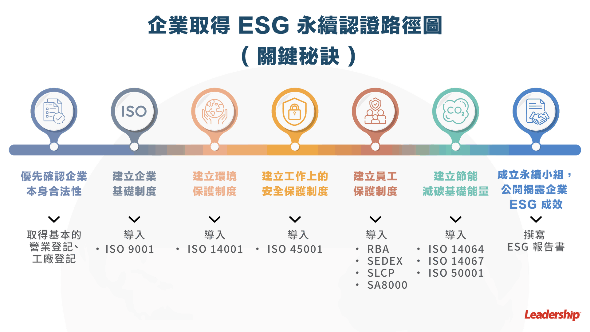 以上 ESG 路徑須依企業規模與能量而定,一般需要 2-10 年的長期規劃與布局,絕非一蹴可及,但針對中小企業往往是一人身兼多職、產能優先導向,因此歡迎隨時 與我們聯繫,領導力企管將提供客製的規劃,協助您更有效率地取得 ESG 認證並提升評分!