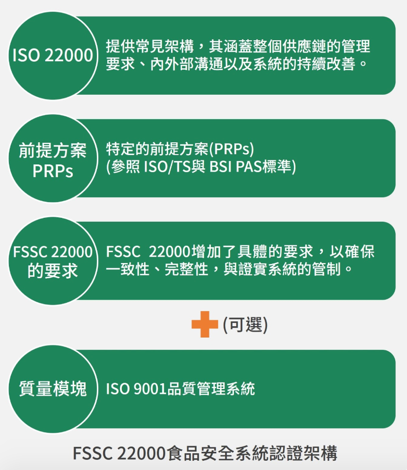 FSSC 22000 食物安全管理系統 (Food Safety System Certification 22000, FSSC 22000),是以現有 ISO 標準為基礎而制定,提供食品安全及品質責任有效管理的架構,並被全球食品安全倡議 (Global Food Safety Initiative, GFSI) 充分認可;企業取得 FSSC 22000認證,代表公司擁有健全有效的食品安全管理系統 (food safety management system, FSMS),並能滿足監管機構、食品企業客戶和消費者的要求。