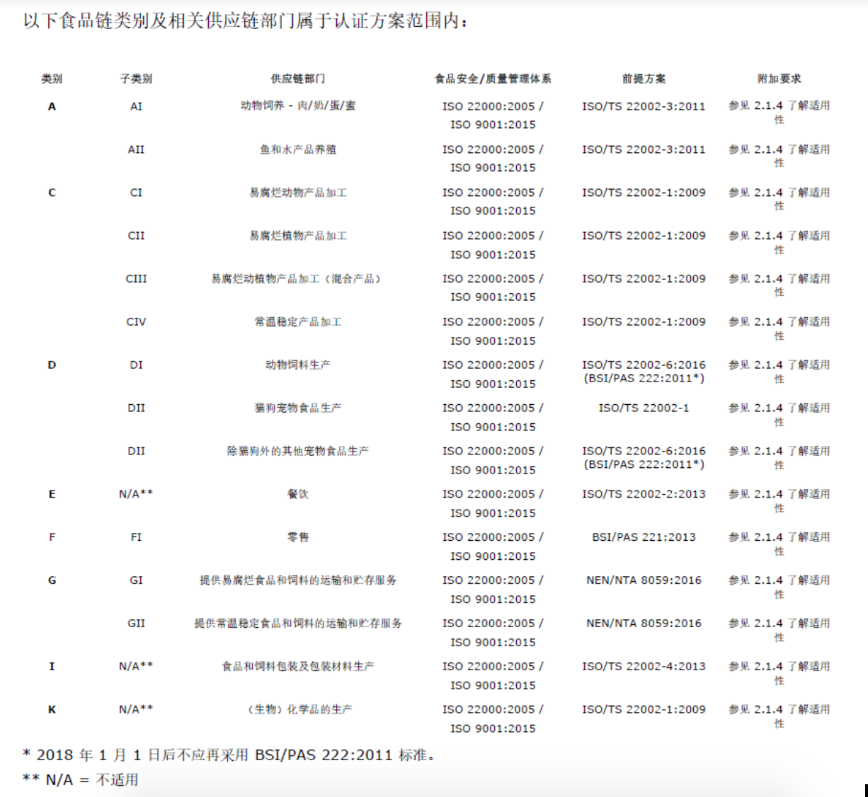 而在 FSSC 22000中,GFSI也在前提方案的標準上進行了調整,加入ISO/TS系列,取代部分原本使用的PAS系列,GFSI將產業分為A~K類,分別說明所對應的 ISO/TS系列或是 PAS等前提方案之規範,供食品產業鏈中的企業選擇適合自己的前提方案來執行。