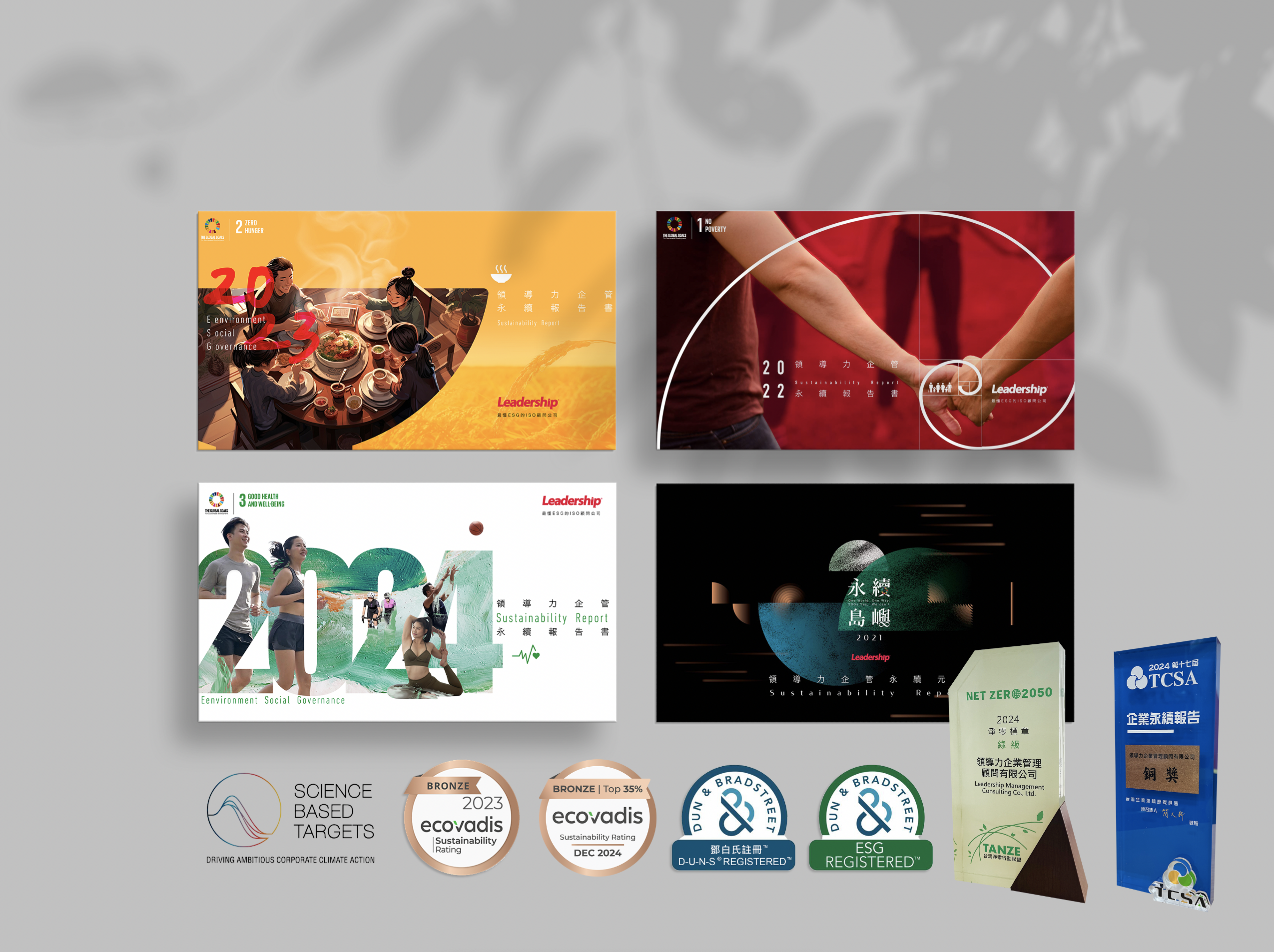 ▲ 領導力企管不僅為各大企業把脈製作 ESG 永續報告書,更是以身作則在 2021 年推出了國內管顧公司第一本 ESG 永續報告書 及 ISO 永續指數指標報告書。2024年度報告書不僅延續 Ecovadis 銅牌佳績,更持續領航全台,成為第一家取得鄧白氏企業認證、SBTi 與 ESG 永續標章之企業管理顧問公司。