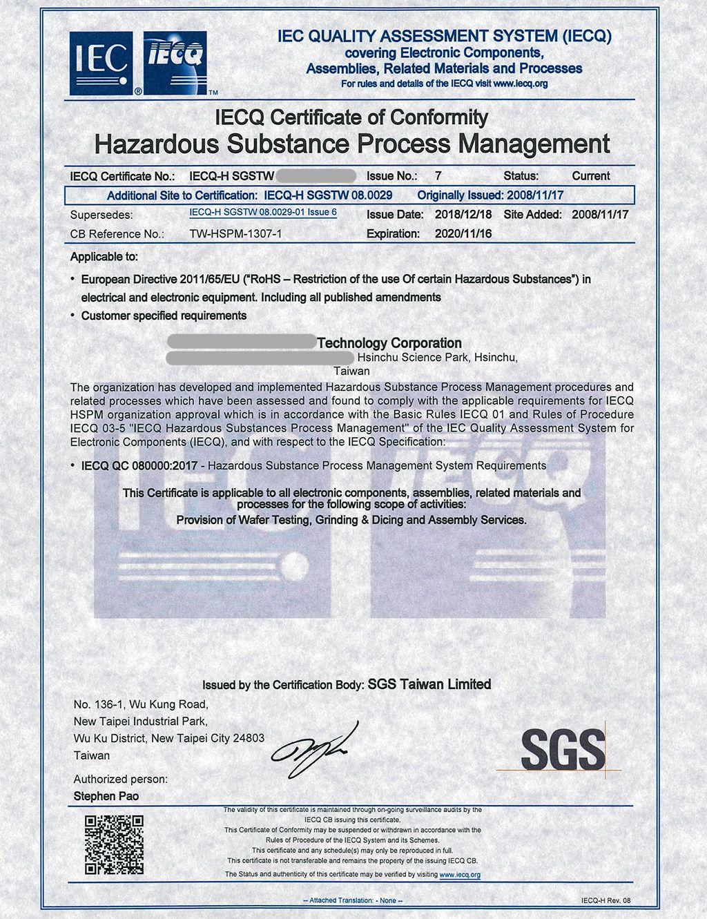 下圖證書大標題為 IECQ 有害物質流程管理合格證書(IECQ Certificate of Conformity)。證書依據的要求為 IECQ QC 080000:2017 有害物質流程管理系統要求(IECQ 080000:2017 Hazardous Substance Process Management System Requirements)。驗證機構為 SGS。請留意,領導力企管不擁有此張圖片之版權,資料來源為企業刊登於官網之公開圖片。ISO 輔導