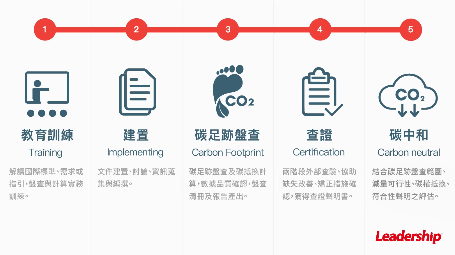 領導力企管擁有眾多環境能源與風險管理系統輔導成功案例,並提供 ISO 14067 最佳管理方案,包括教育訓練、流程建置、碳足跡盤查、外部查證及碳中和,透過紮實五步驟協助企業建置完整碳管理,歡迎立即與我們聯繫。