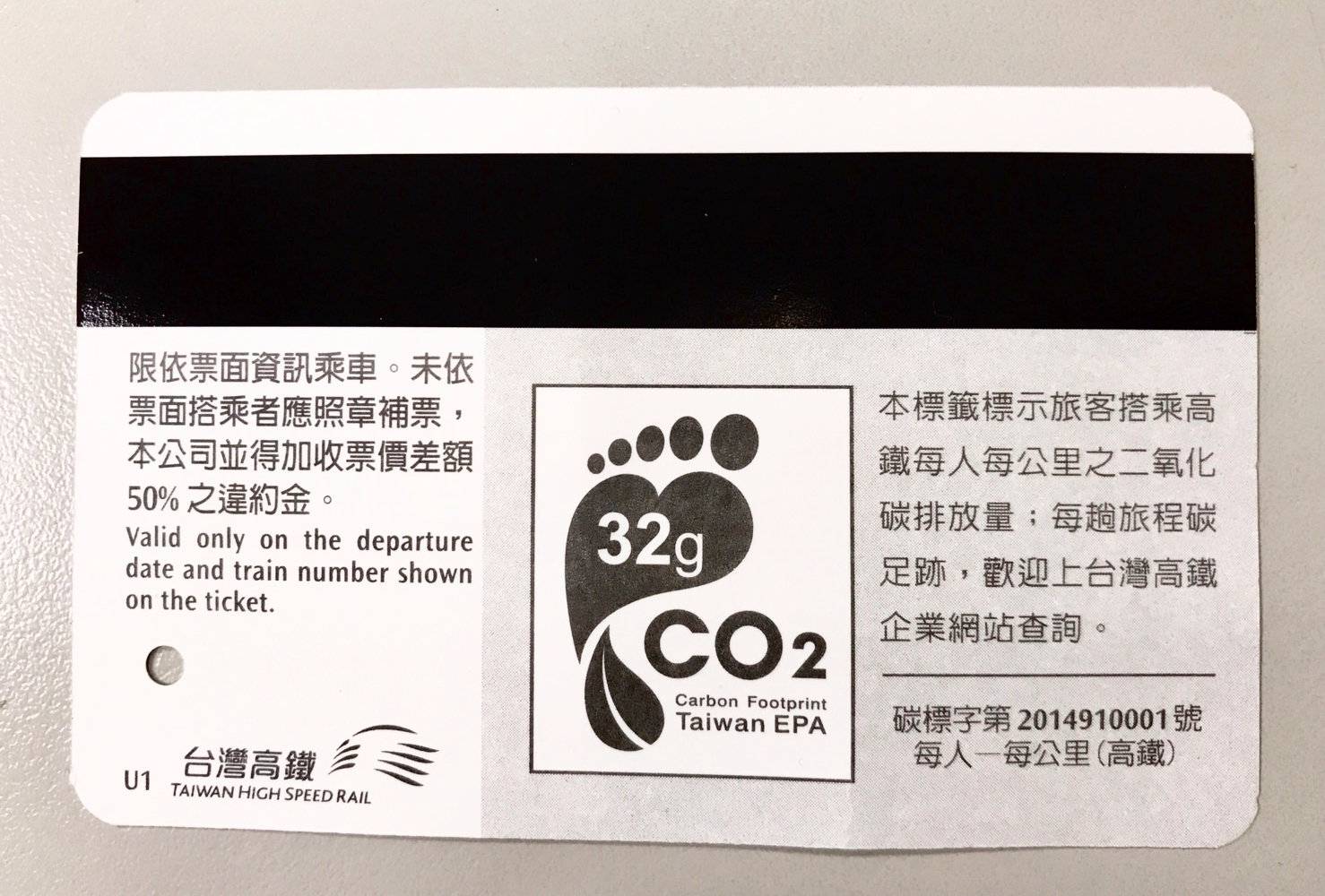 「服務碳足跡」是指展覽活動、作業處理等過程所產生的碳排放量,如高鐵的載運作業。碳足跡數據如高鐵車票所示(圖片來源:台灣高鐵票根)