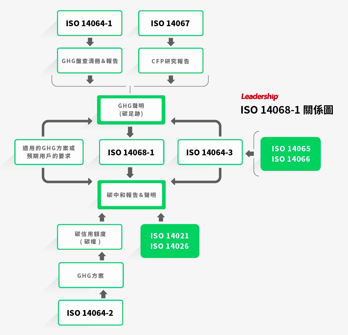 為明確定義及規範碳中和,過往大多使用英國標準協會(BSI)於 2010 年出版「碳中和實施標準(Specification for the Demonstration of Carbon Neutrality, PAS 2060)」執行碳中和的活動。直到國際標準組織於 2023 年 11 月正式發布本標準,借以取代 PAS 2060(碳中和),該標準為組織、產品和服務提供原則、要求和指南,以透過量化、減少和抵消來實現和展示碳中和。企業執行碳中和時,應優先考慮減少溫室氣體排放(直接和間接)和加強溫室氣體移除的行動,並要求碳權抵消僅用於當企業進行減量行動後,針對其剩餘的碳排放。與 ISO 14068-1:2023 相關國際標準其關係如下: