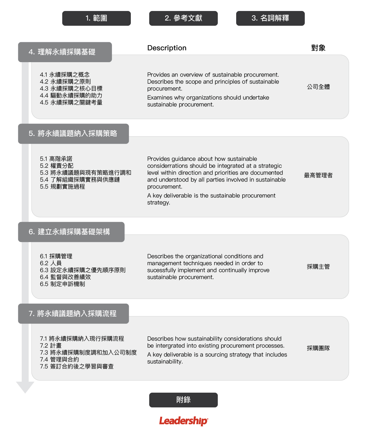 | ISO 20400 | 永續採購標準,協助組織制訂永續採購策略之指引。 |