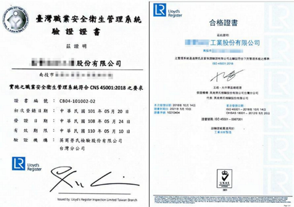▼ TOSHMS 和 ISO 45001證書樣式範本