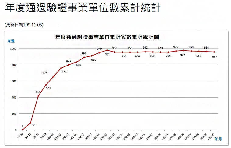截自 2020年 11月勞動部職安署的統計資料,全台通過 TOSHMS的廠商共計 957家,從 2016年開始已連續五年突破 900家申請驗證暨續證。