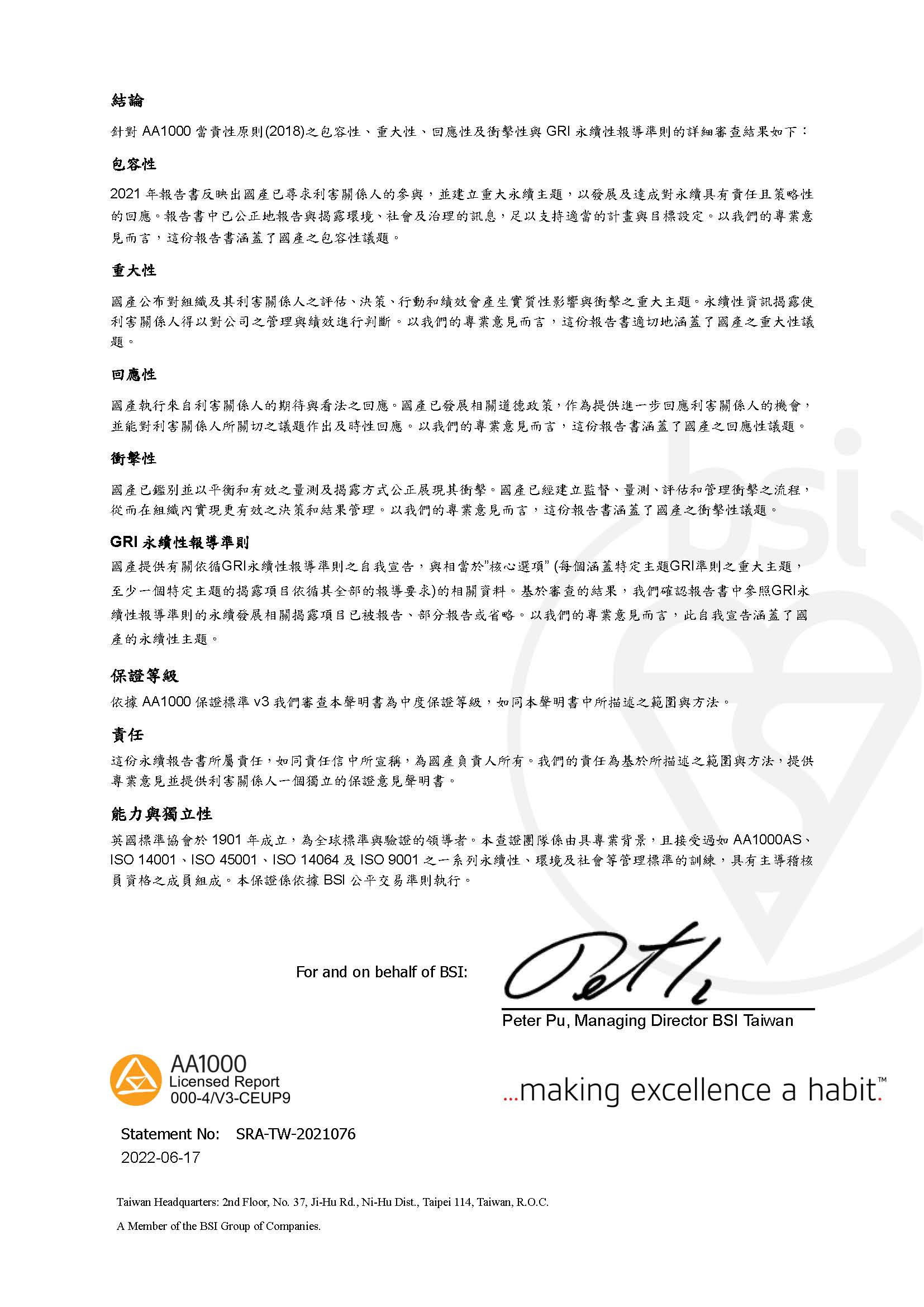 國產建材 2021年 ESG 報告書通過 BSI 查證