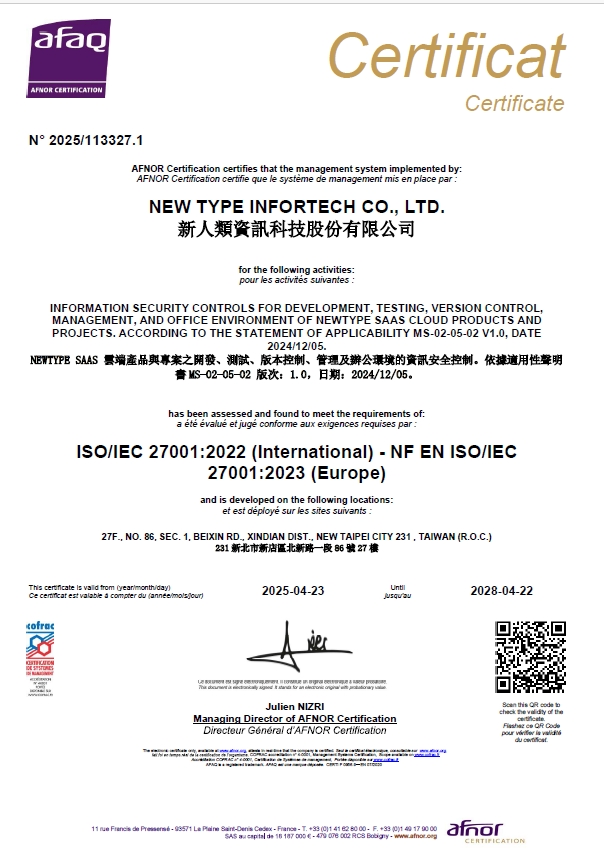 在領導力企業管理顧問公司專業輔導下,恭喜 新人類資訊科技股份有限公司 順利完成ISO27001:2022 資訊安全管理系統( Information Security Management System,ISMS )教育訓練( Training )、系統建置( Implementing )、外部稽核驗證 ( Certification )3大實施流程,並順利取得 ISO27001 證書。