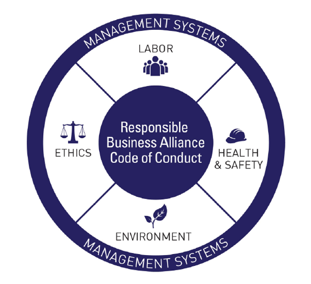 RBA 行為準則(RBA Code of Conduct,2023 年 7 月現行版本為 RBA 行為準則 7.0)就如同 ISO 9001、ISO 14001 的標準、原則,都需要隨著時間空間的改變,跟著調整內容,ISO各標準審查頻率不一,而 RBA 則是每三年進行一次修訂。 修訂過程已於 2022 年開始預計於 2023 年底前完成修訂,原本五大主題(圖下)仍維持不變:(A) 人權、(B) 健康安全、(C) 環保、(D) 道德、(E) 管理系統。