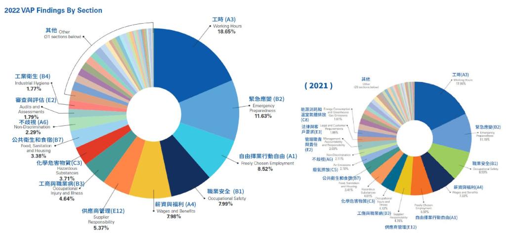 2022 年度 RBA 稽核缺失第一名與 2020、2021 年相同,仍是工時 (A3*) (註2),其次依序為:緊急應變 (B2)、自由擇業行動自由 (A1)、職業安全 (B1)、工資 (A4)、供應商管理 (E12)、工商與職業病 (B3)、化學危害物質 (C3)、公共衛生和食宿 (B7)、不歧視 (A6)、內部稽核 (E10)、職業建康 (B4)。