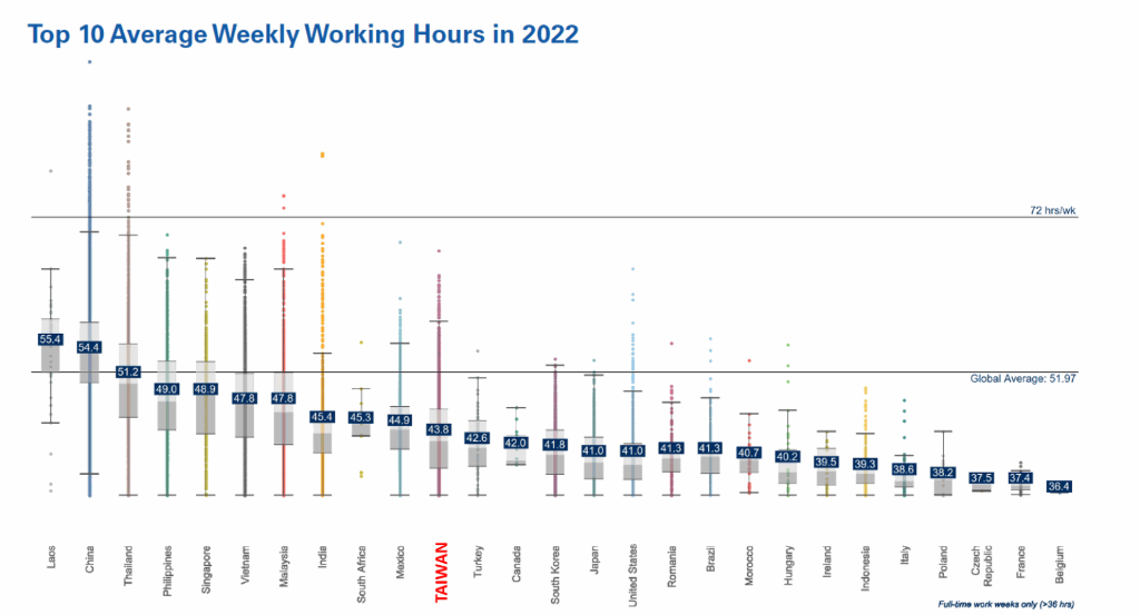 關於 RBA 稽核缺失中蟬聯多年第一名的工時 (A3),RBA 特別整理了相關統計。2022 年全球參與 RBA 稽核之企業平均工時為 48.8 小時,其中 寮國 的每周平均工作時間為全球最高 55.4 小時,其次是中國 54.4 小時、泰國 51.2 小時、菲律賓 49 小時,台灣則是掉到全球工時超時前 10 名以外,來到 43.8 小時,顯示超時問題有漸漸改善。值得關注的是平均工時最低國家為比利時、法國、捷克。