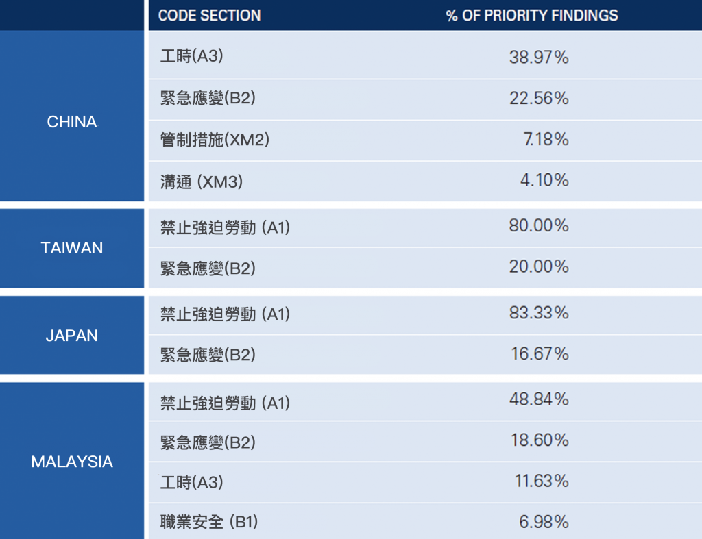 RBA VAP 前四大稽核國家(中國、台灣、日本、馬來西亞)之缺失 TOP4,趨勢都普遍集中於工時 (A3)、自由擇業(A1)、緊急應變 (B2)、工傷與職業病 (B4),反而這四國在工時上的表現較於其他國家相對良好。
