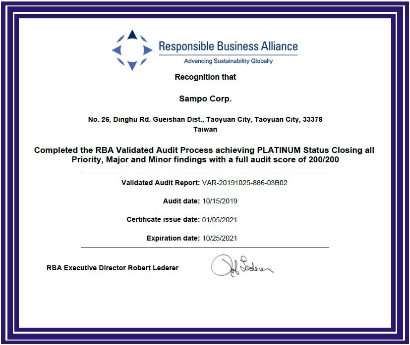 RBA VAP 證書 recognization 範例-聲寶 RBA 白金證書