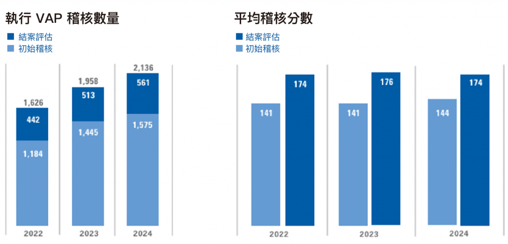 在 VAP 稽核方面,2024 年全球 VAP 和 SVAP 的總稽核次數從 1,958 件提升至 2,136 件,總場次增加逾兩成 。中國仍是最大的稽核國,佔比 45% 。台灣與越南則以 8% 的佔比緊隨其後 。