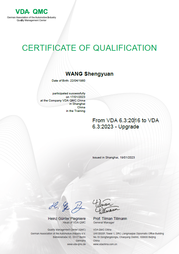 - VDA(China) VDA6.3 過程稽核員 & VDA6.3:2023升級培訓證書