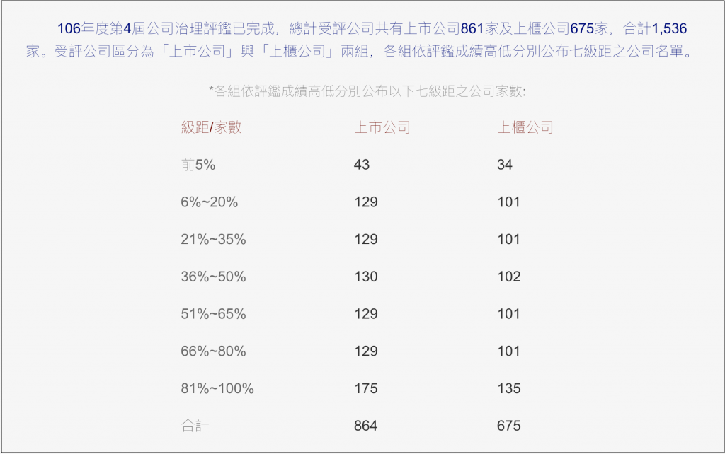 依據證交所於2018年5月2日公告,106年度第4屆公司治理評鑑結果出爐,總計受評公司共有上市公司861家及上櫃公司675家,合計1,536家。受評公司區分為「上市公司」與「上櫃公司」兩組,各組依評鑑成績高低分別公布七級距之公司名單。