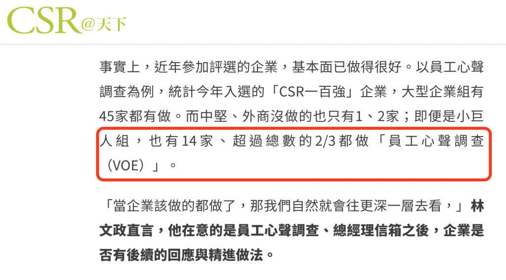 因此,是否定期進行員工心聲調查、例行性舉辦勞資協商、收集新進及已離職人員的意見,或設立如總經理信箱等溝通管道等,都是評審觀察的基本盤。事實上,近年參加評選的企業,基本面已做得很好。以員工心聲調查為例,統計今年入選的「CSR一百強」企業,大型企業組有45家都有做。而中堅、外商沒做的也只有1、2家;即便是小巨人組,也有14家、超過總數的2/3都做「員工心聲調查(Voice of the Employee,VOE)。