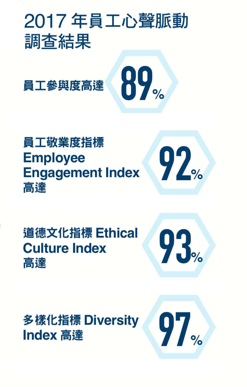 2017年10月花旗(台灣)員工心聲脈動調查(VOE Pulse Survey)結果出爐,花旗(台灣)以平均90%以上的滿意度,遙遙領先亞洲其他國家。資料來源:花旗(台灣)2017企業社會責任報告書。