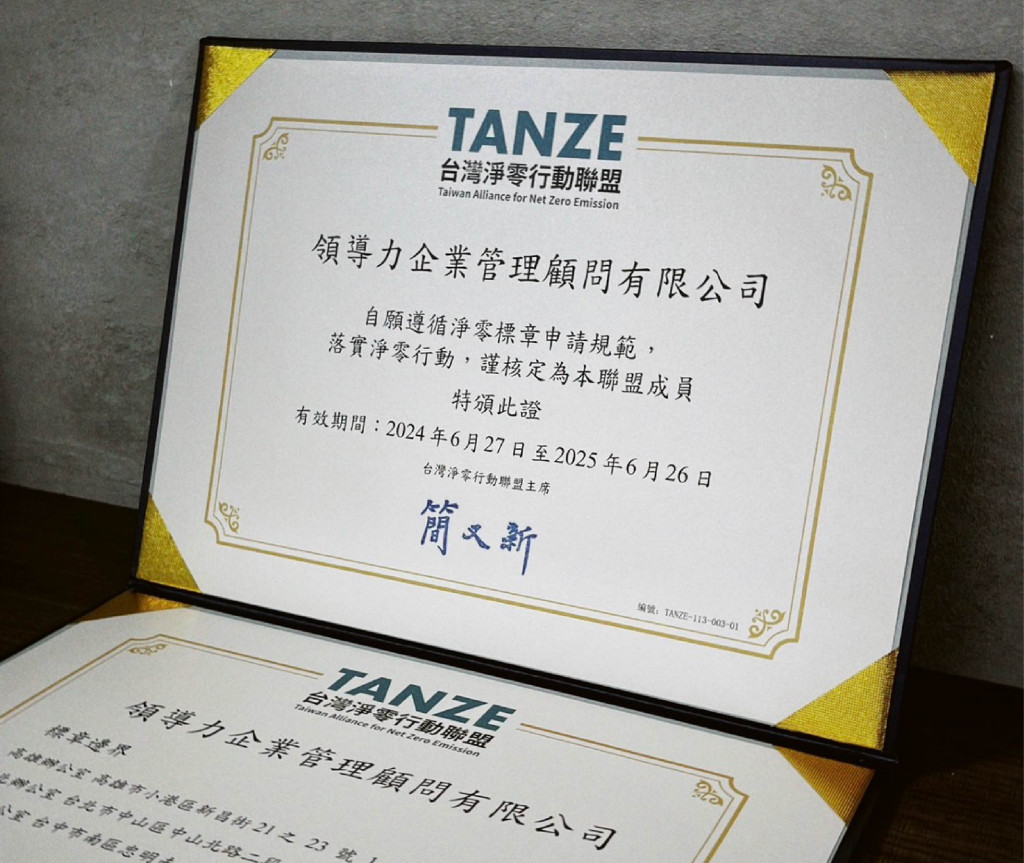 國內知名永續報告書輔導公司領導力企管於 2024 年 6月底,成為臺灣顧問業第一間自願遵循淨零行動聯盟標章之公司。2026 年的目標,致力於在服務場域(包括辦公室)內減少基準年排放量 20%。領導力透過多項節能減碳舉措,規劃 ISO 14064-1 查證計畫,將以精準量化數據規劃減碳路徑並督促執行進度,在淨零的道路上,輔導臺灣金控、遠東百貨(2903)、嘉里大榮(2608)知名企業完成碳盤查,關貿網路(6183)、茂順密封元件(9942)完成 ISO 14067 產品碳足跡輔導,共同為淨零願景而努力。