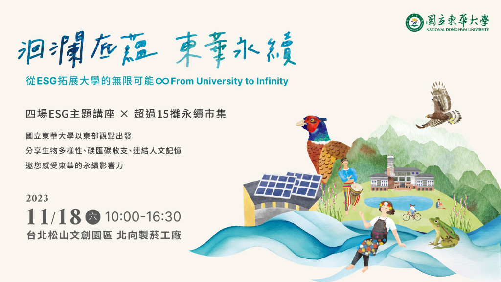 透過 11/18(六) 舉辦的免費講座暨市集活動,國立東華大學專業講師將討論今年永續發展趨勢中熱議的淨零碳排、生物多樣性等議題在花蓮以及從大學角度出發的觀點,並結合創校以來「跟地方在一起」共伴共好精神的大學社會責任實踐計畫、從梳理史料檔案進一步尋回高砂義勇隊歷史記憶的亮點計畫,透過不同面向展現東華在永續發展方面的成果。