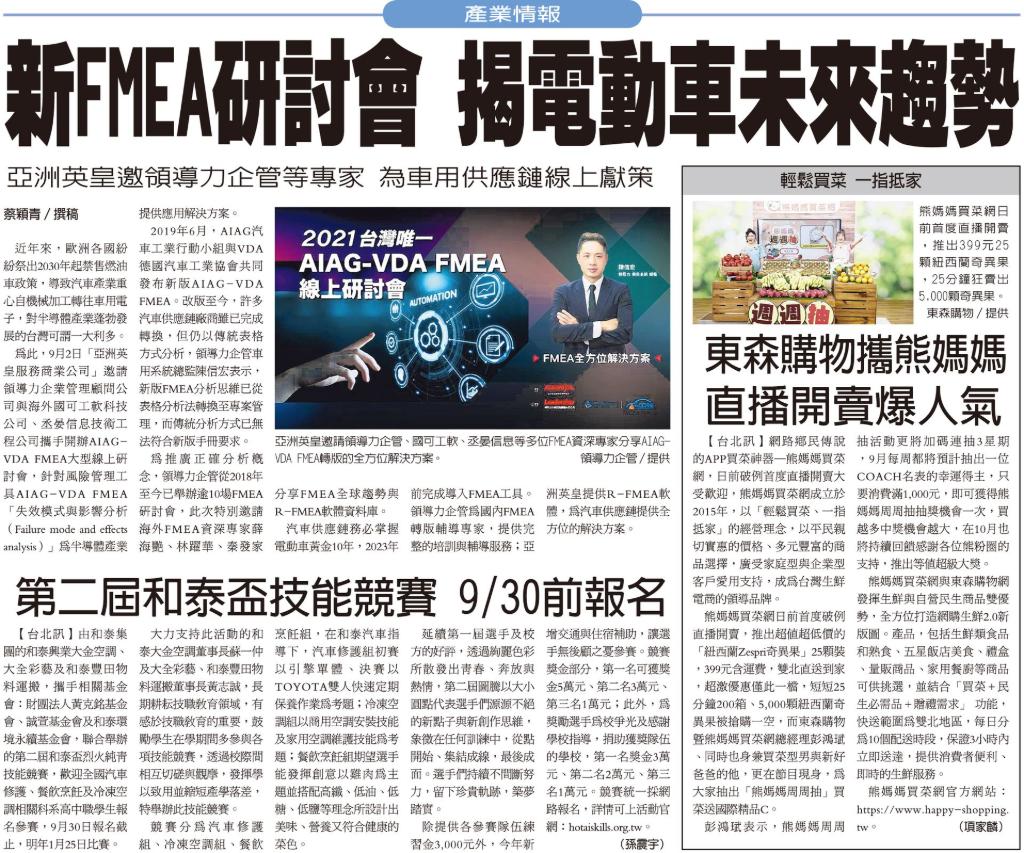 近年來,歐洲各國紛紛祭出從2030年起禁售燃油車政策,導致汽車產業重心自機械加工轉往車用電子,對半導體產業蓬勃發展的台灣可謂一大利多。為此,9月2日「亞洲英皇服務商業有限公司」邀請「領導力企業管理顧問有限公司」與中國國可工軟科技有限公司、上海丞晏信息技術工程有限公司攜手開辦今年 2021年度全台首場的 AIAG-VDA FMEA 大型線上研討會,針對風險管理工具 AIAG-VDA FMEA「失效模式與影響分析(Failure mode and effects analysis)」為半導體產業提供應用解決方案。