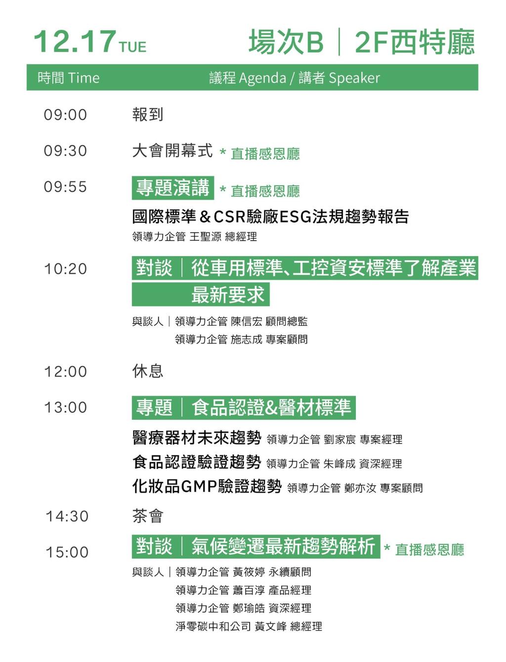首日 12/17 ISO 專場 將深入解析各領域 ISO 國際標準,協助綠領工作者及企業掌握國際規範的最新發展