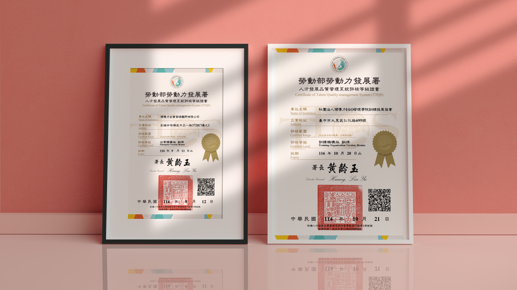 近日領導力企業管理顧問有限公司與社團法人領導力ISO管理學院訓練發展協會雙雙傳來捷報,兩家機構榮獲「人才發展品質管理系統 (TTQS) 評核等級證書」國家級肯定,分別取得「企業機構版銅牌」及「訓練機構版銅牌」肯定。