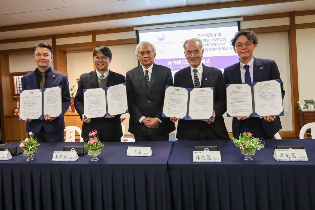 ▲ 領導力企管王聖源總經理(左一)、馬雅資訊黃崇益幕僚長(左二)、亞洲準譯李定寰營運長同為慈大校友企業與慈濟教育志業、醫療志業體鈞長簽署 MOU (照片來源:慈濟大學)