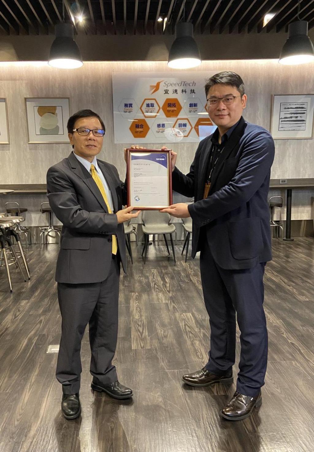 宣德科技張誌仁總監(右)與 TUV Nord香港商漢德技術監督服務亞太有限公司台灣分公司總經理葉政治頒證合影。宣德科技/提供。