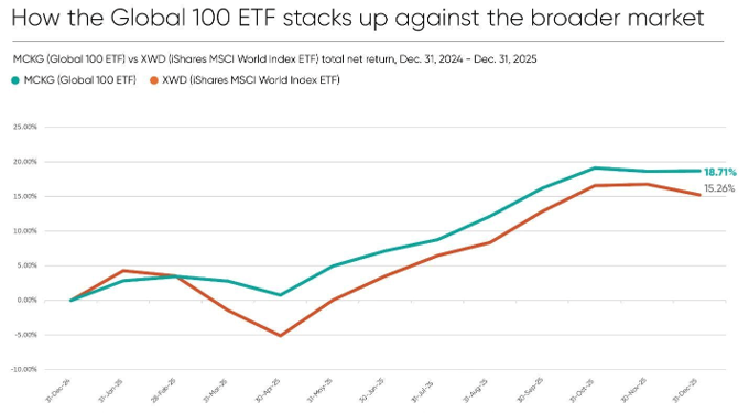 長期以來,資本市場經常爭論追求 ESG 目標是否會犧牲企業的財務獲利能力。然而,CK 對 2026 年榜單企業的財務回報分析,提供了一個強有力的反證,顯示「永續」與「獲利」不僅不衝突,反而是創造超額報酬的來源。根據 CK 分析,追蹤 Global 100 表現的 Mackenzie Corporate Knights Global 100 Index ETF (MCKG),在 2025 年間,繳出了 18.71% 的總回報率。相較之下,代表全球股市大盤的 iShares MSCI World Index ETF (XWD) 同期回報率為 15.26%。這兩者之間存在著超過 3 個百分點的顯著差距。