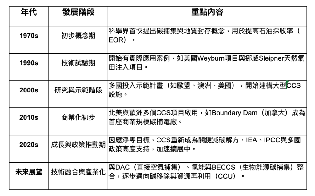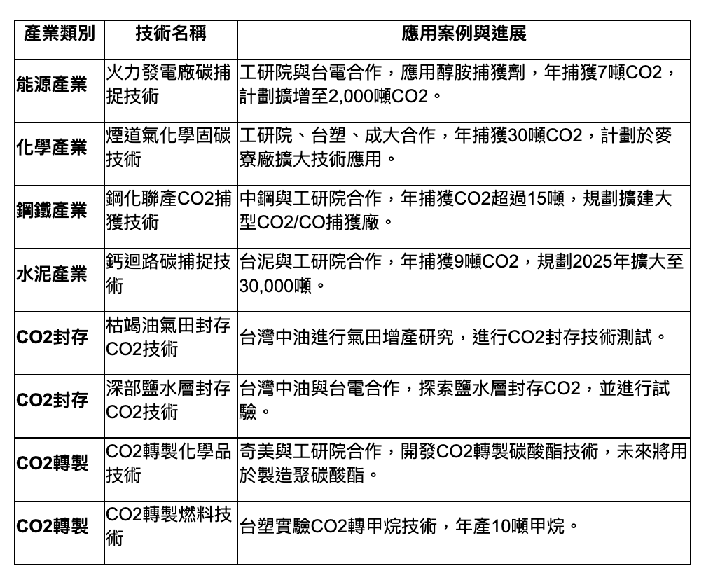 台灣的碳捕集技術(CCS)正處於初期階段,並積極應用於能源、化學、鋼鐵和水泥等產業。雖然各大企業正在合作開發並擴大技術應用,但目前的CCS技術仍需進一步的測試與驗證,尚未進入大規模商業化應用。