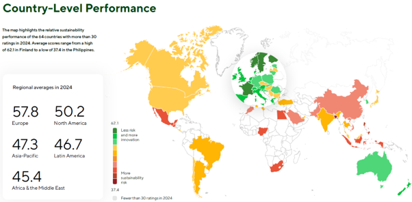 數據顯示,全球永續績效存有顯著區域分化,歐洲以 57.8 分領先,亞太地區則為 47.3 分 (Fig. 1) 。報告指出,永續管理是需要持續投入的過程,而非單次合規任務 :