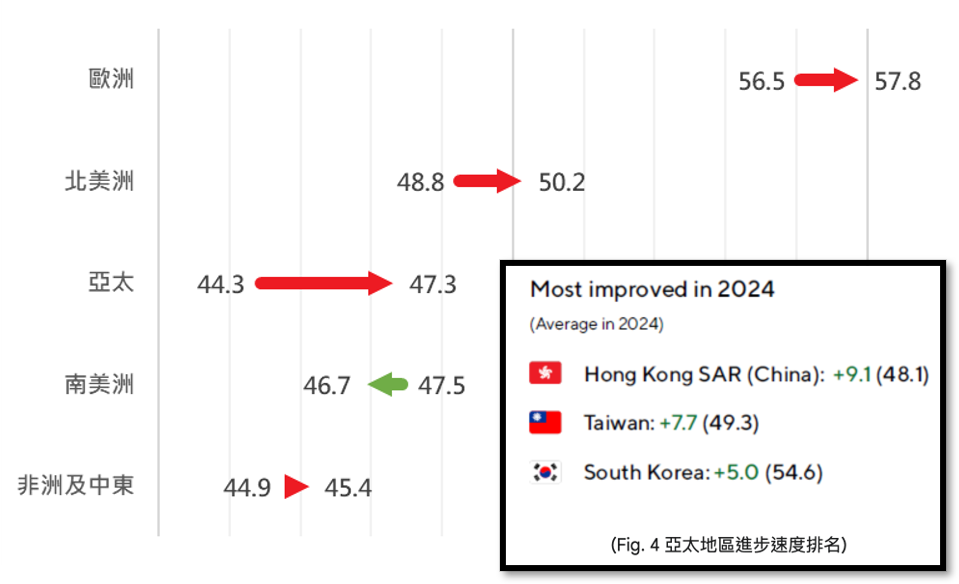 - 亞太地區強勁追趕: 亞太地區在 2024 年取得了最快的分數增長 (+3.0分) 。這股強勁的勢頭,主要由香港 (+9.1分) 、台灣 (+7.7分) 與南韓 (+5.0分) 的顯著進步所驅動。 (Fig. 3, 4)