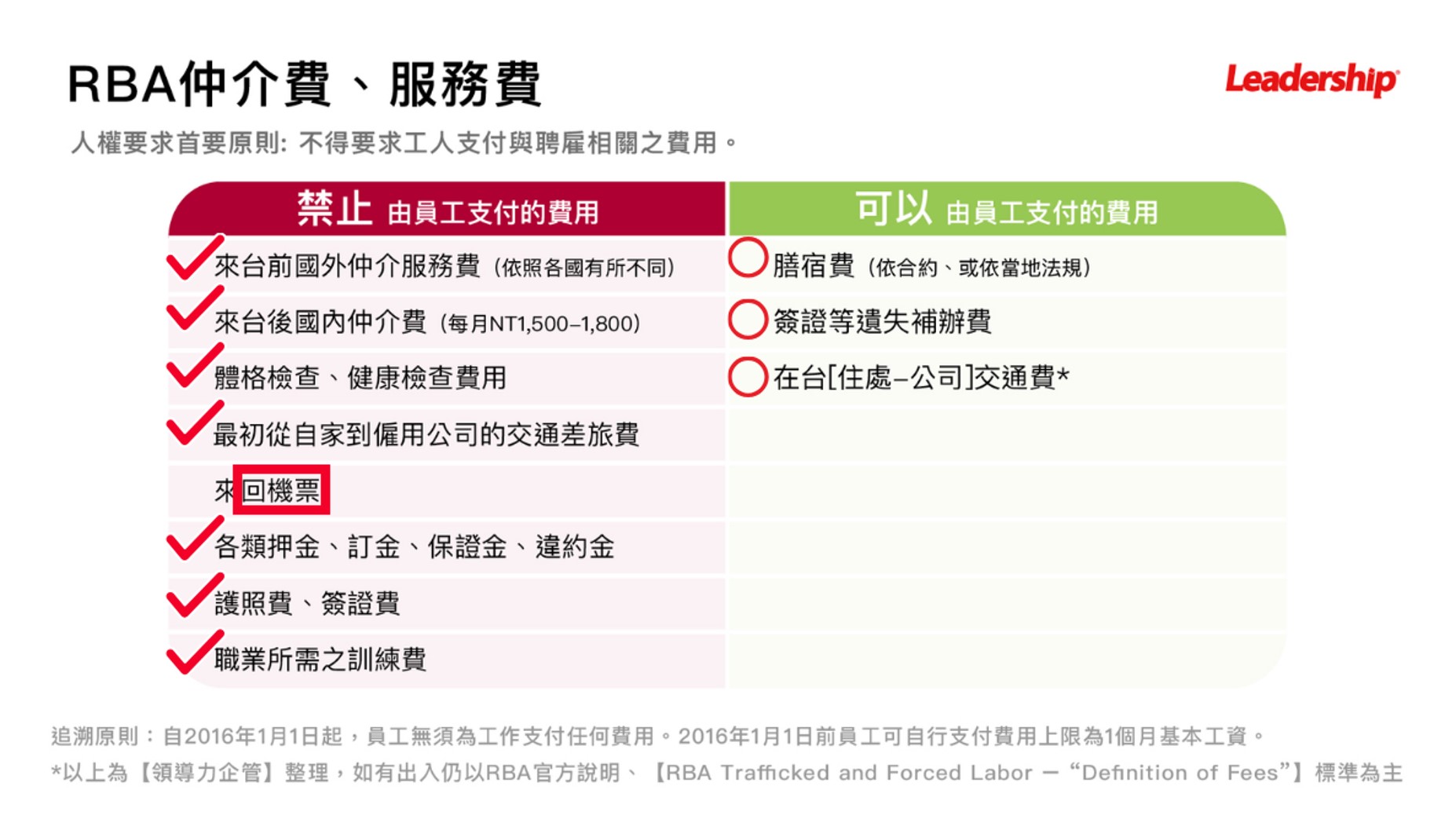「RBA 費用定義標準」列舉以下任何階段從雇主、國內仲介、國外仲介等其他機構產生的直接或間接招募相關費用,均不得由員工(包含臨時工、移民、學生、合約工、直接員工和任何其他類型的員工)支付: