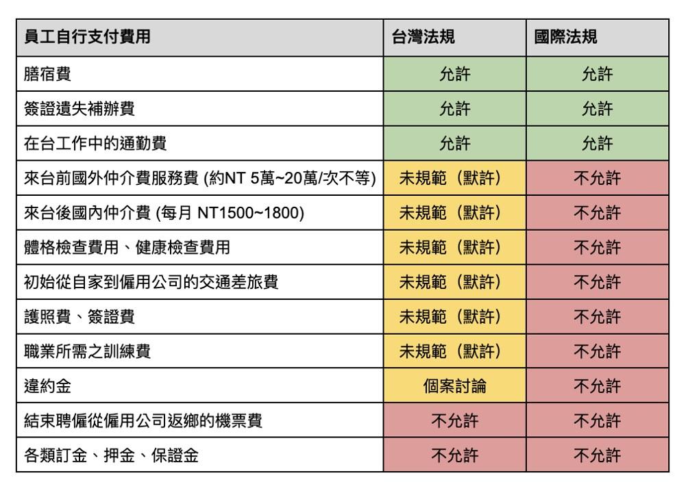 換個方式再羅列一次台灣法規、國際規範允許不允許由員工自行支付的費用: