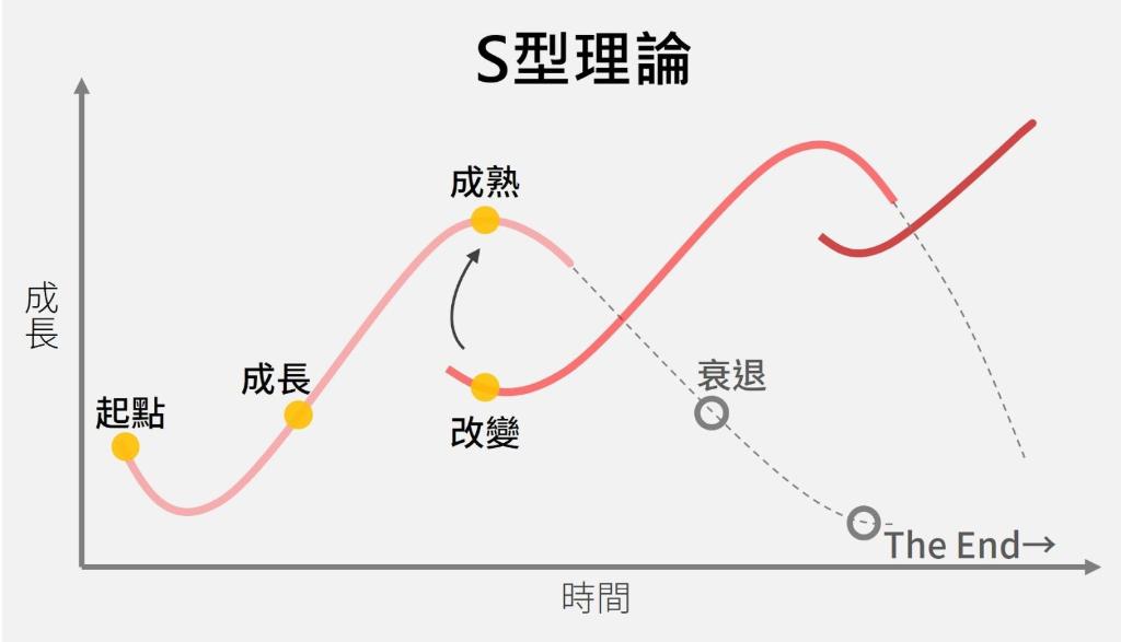 根據企業成長的生命週期,我們可以用下圖S型理論的表述。一個組織從起點,到成長階段,再到成熟期,接著,會慢慢的衰退。