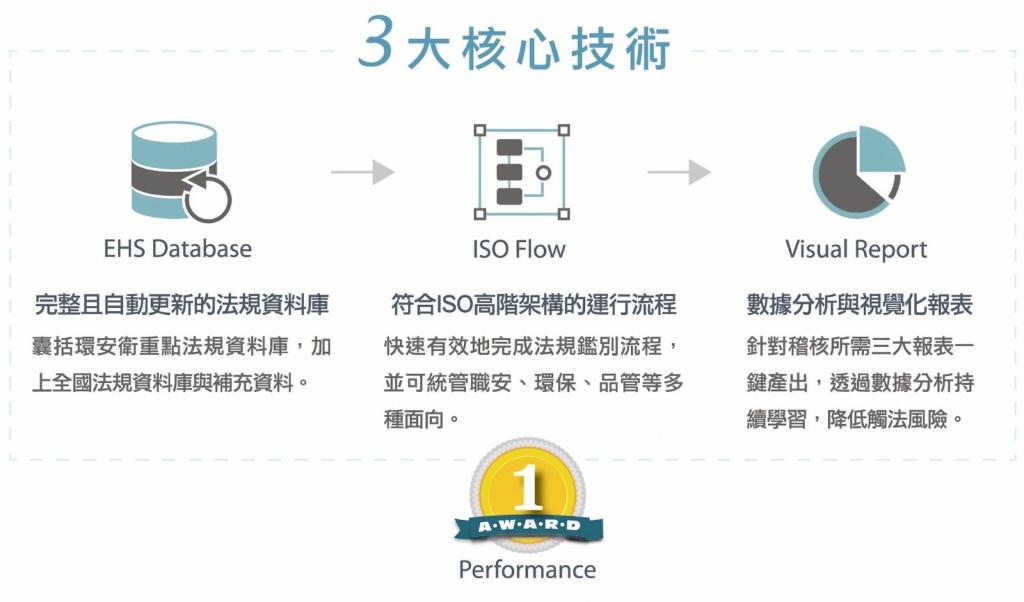 在台灣,也有一些法規鑑別管理工具,例如威煦軟體所推出的法規雲(Legal)系統,就是一個完整並成熟的解決方案軟體,法規雲具有三大效益: