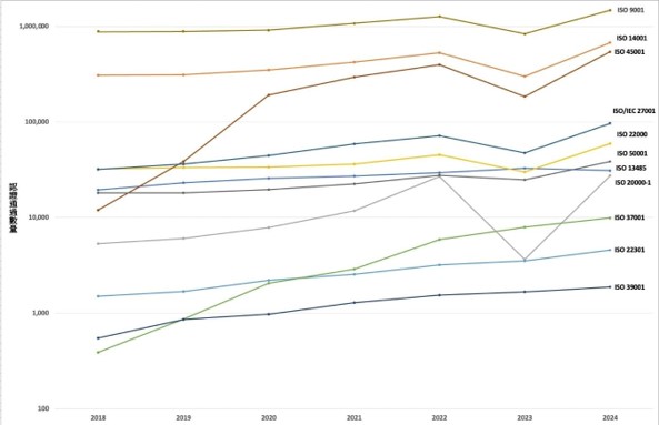 從2018至2024年的ISO Survey數據顯示(下圖),全球主要管理系統標準認證家數整體呈成長態勢。惟2022至2023年間約半數指標出現統計性下滑,主因為中國認證機構未提供其 ISO 調查數據,導致影響全球數據的完整性。但長期趨勢仍清晰指向同一結論:企業對國際管理標準的需求與依賴度不減反增。