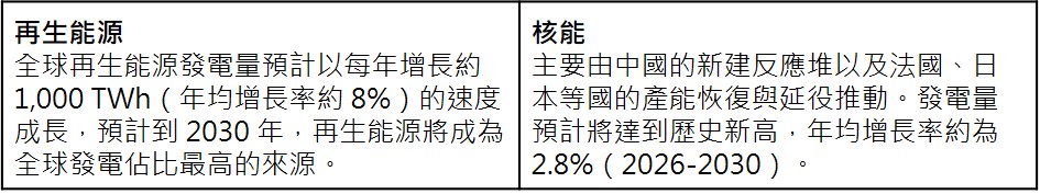 隨著人工智慧產業蓬勃發展,資料中心的用電需求飆升1。報告中指出,2024 年電力需求成長 4.4%,為 30 年來首次出現用電需求成長,超越經濟成長的情形。2025 年雖然稍微降低至 3%,但該年度先進經濟體佔全球電力需求增長的比例接近 20%,主要成長來自於資料中心、電動車及空調需求。預期 2026 年至 2030 年全球電力需求將加速,平均年增長率達到 3.6%。這意味著,電力不再僅是經濟活動的支撐工具,而成為驅動新一輪產業發展的核心基礎。