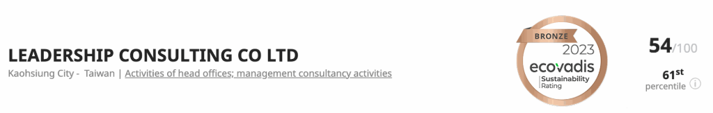 領導力企管成為國內第一間通過Ecovadis評鑑的管顧公司。評鑑顯示:我們在環境管理、員工關係及社會參與表現,優於同行業水準,並落實GRI、SDGs倡議,發表ESG永續報告書。